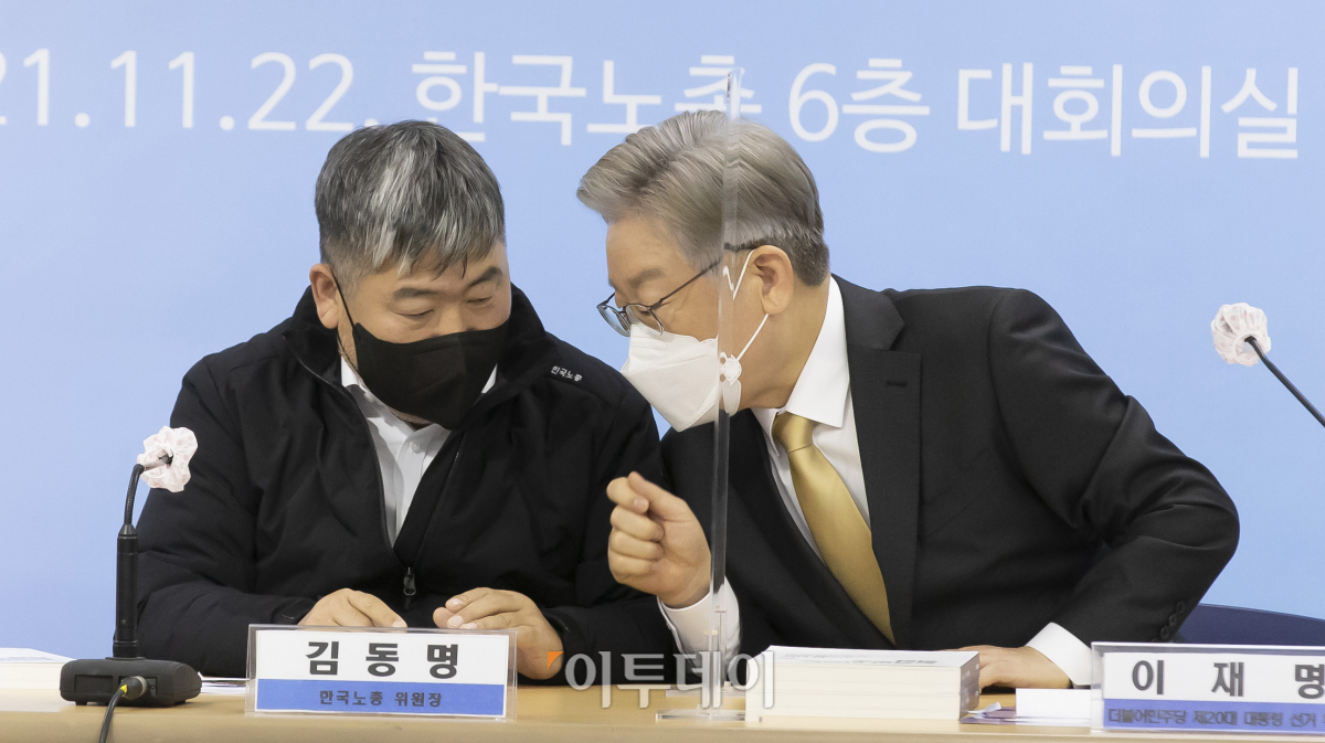 [포토] 대화하는 이재명 민주당 대선후보-김동명 한국노총 위원장