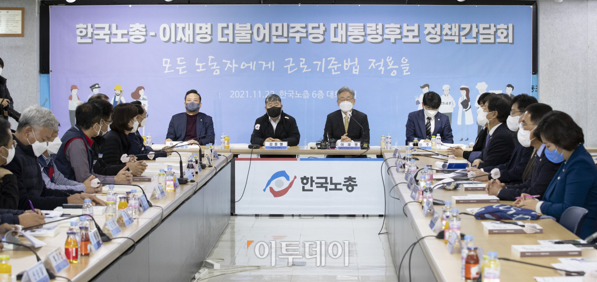 이재명 더불어민주당 대선 후보(뒷줄 오른쪽 둘째)가 22일 오전 서울 영등포구 한국노동조합총연맹 빌딩에서 열린 간담회에서 발언하고 있다.