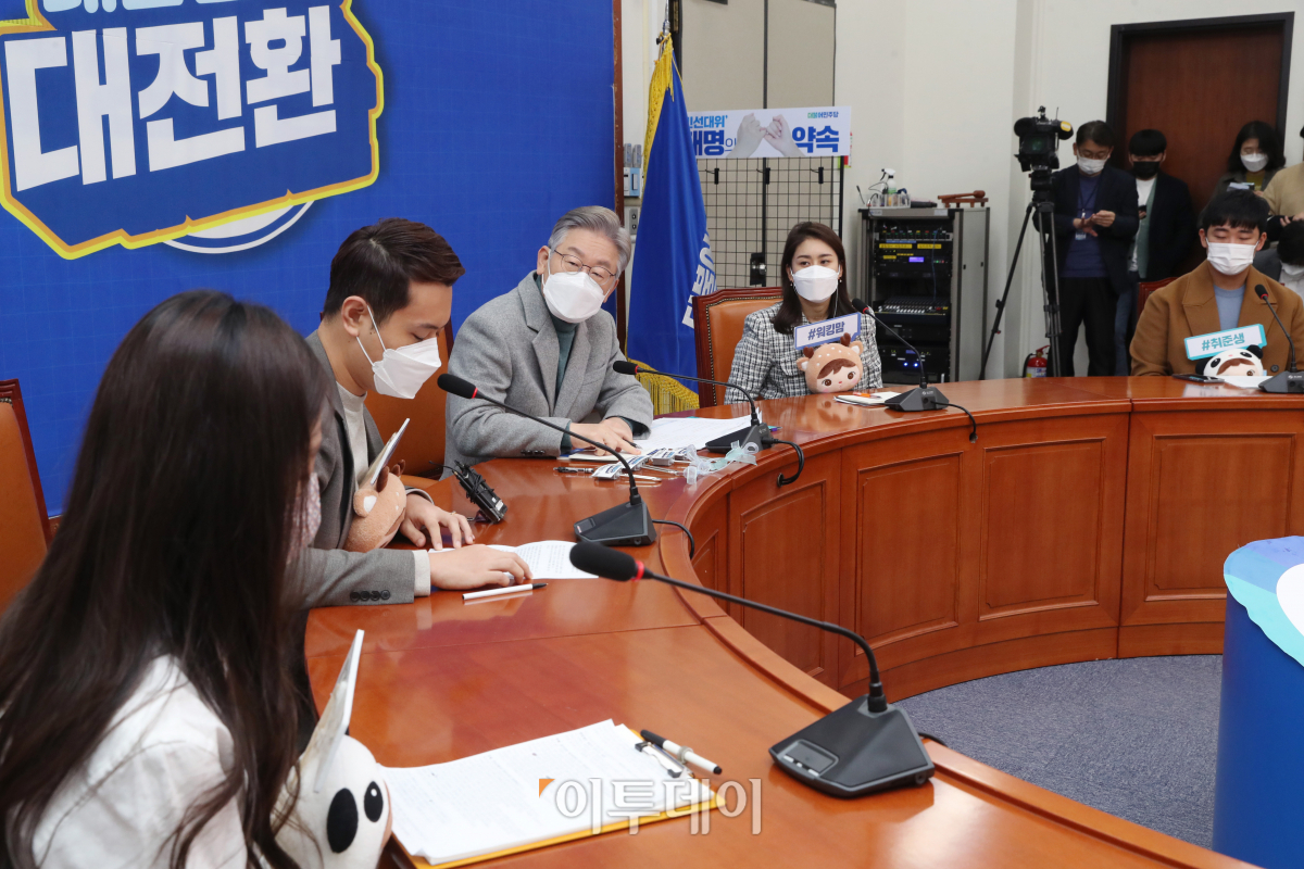 더불어민주당 이재명 대선 후보가 22일 오전 서울 여의도 국회에서 열린 '전국민선대위-청년과 함께 만드는 대한민국 대전환' 에서 취준생, 워킹맘, 신혼부부, 청년창업자들의 발언을 듣고 있다.