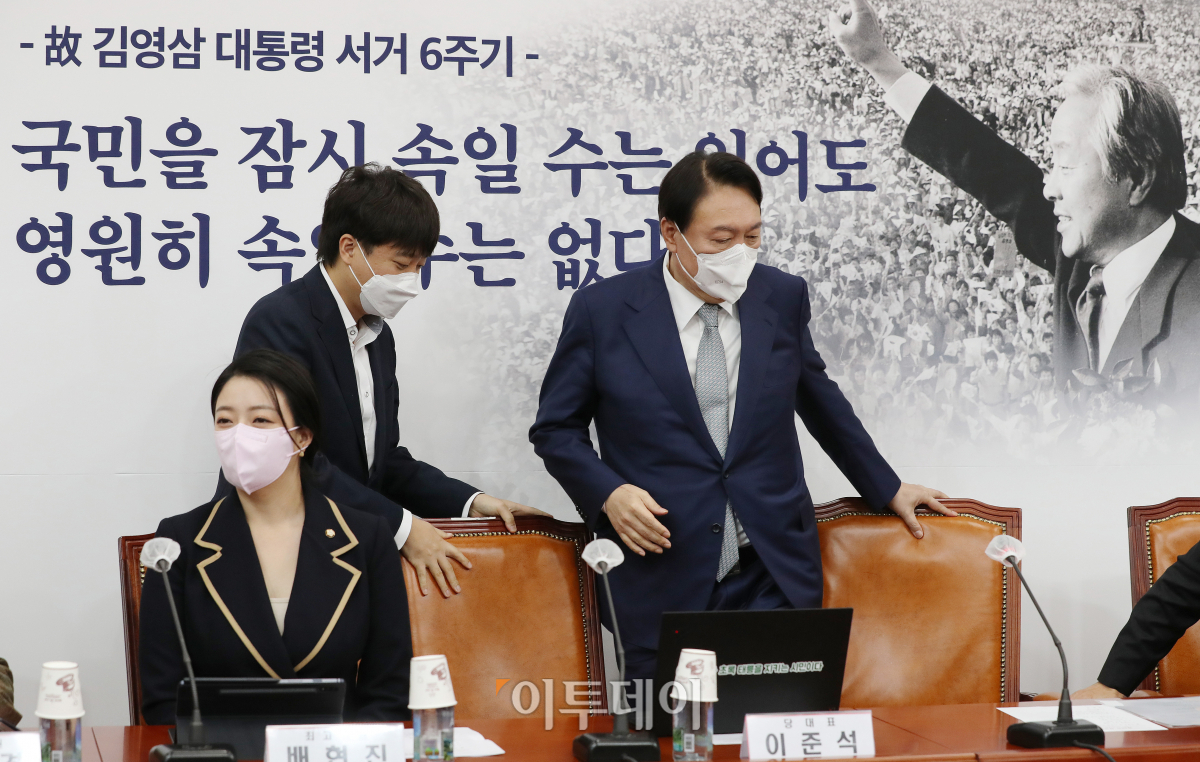 국민의힘 윤석열 대선 후보와 이준석 대표가 22일 서울 여의도 국회에서 열린 국민의힘 최고위원회의에 참석하고 있다.