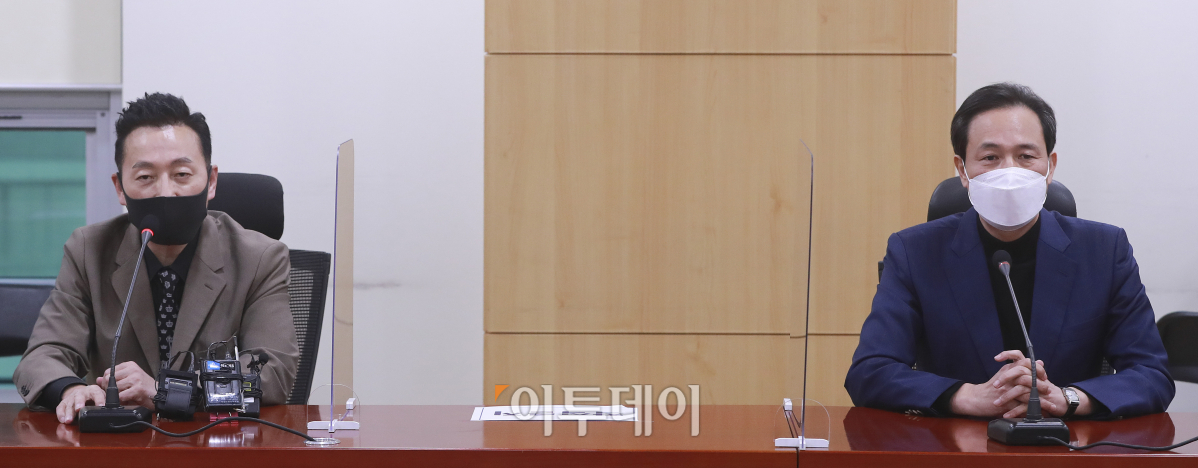 정봉주 전 의원(왼쪽)이 22일 오후 서울 여의도 국회 의원회관에서 열린 더불어민주당-열린민주당 통합 협상 대표단 상견례에서 모두발언을 하고 있다. 오른쪽은 우상호 더불어민주당 의원.