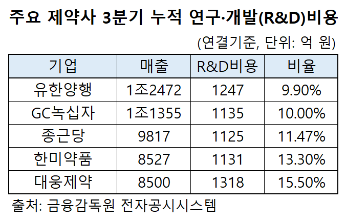 23일 금융감독원 전자공시시스템에 제출된 상위 5개(빅5) 제약사 분기보고서에 따르면 모두 올해 3분기까지 1000억 원이 넘는 R&D 비용으로 지출했다. 이들 제약사는 매출 대비 평균 12%를 R&D에 투자한 것으로 나타나 매출 증가가 R&D로 이어지는 선순환 구조를 마련했다.