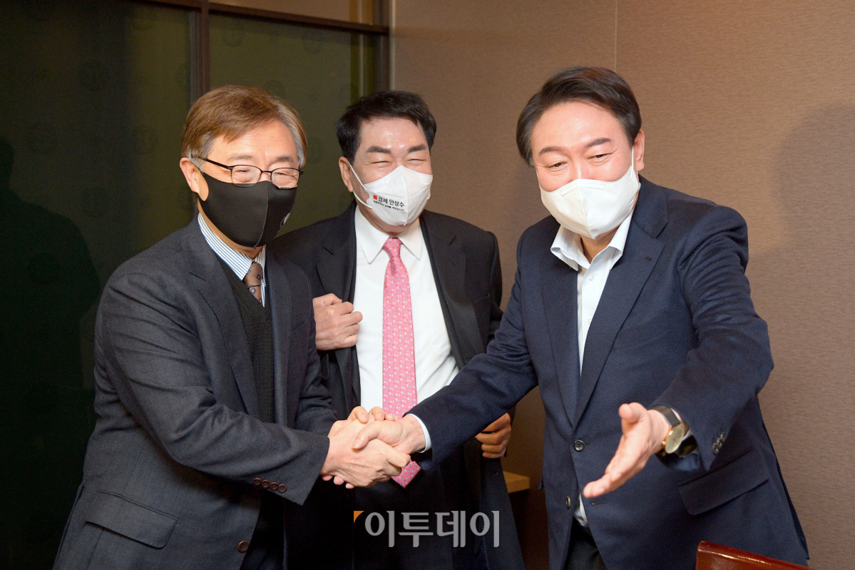 윤석열 국민의힘 대선 후보가 23일 서울 여의도의 한 음식점에서 대선 경선 주자들과의 오찬에 참석해 최재형 전 감사원장과 악수하고 있다. 가운데는 안상수 전 인천시장.