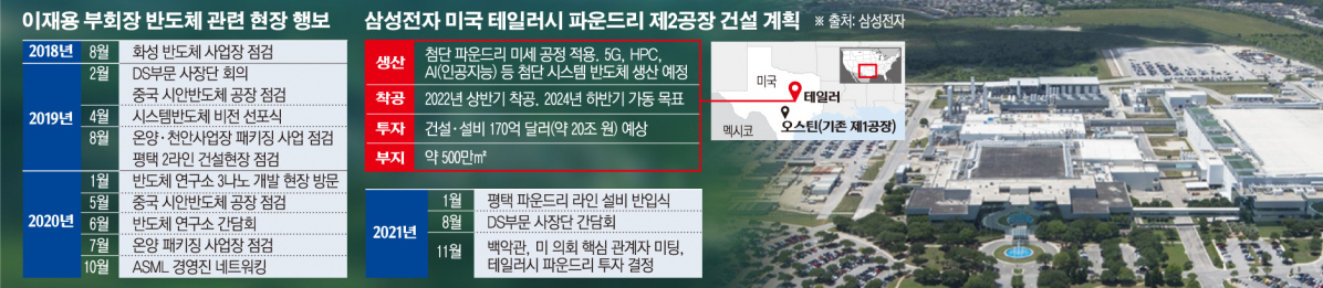 이재용 부회장은 1월 4일 삼성전자 평택 2공장의 파운드리 생산설비 반입식에 참석한 후, 반도체부문 사장단과 중장기 전략을 살폈다.
