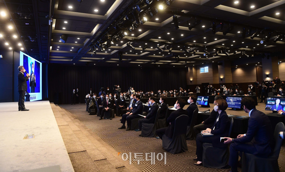 이재명 더불어민주당 대선후보가 24일 서울 여의도 중소기업중앙회에서 열린 중소기업 비전발표회에서 중소기업 정책 및 비전에 대해 프레젠테이션하고 있다.