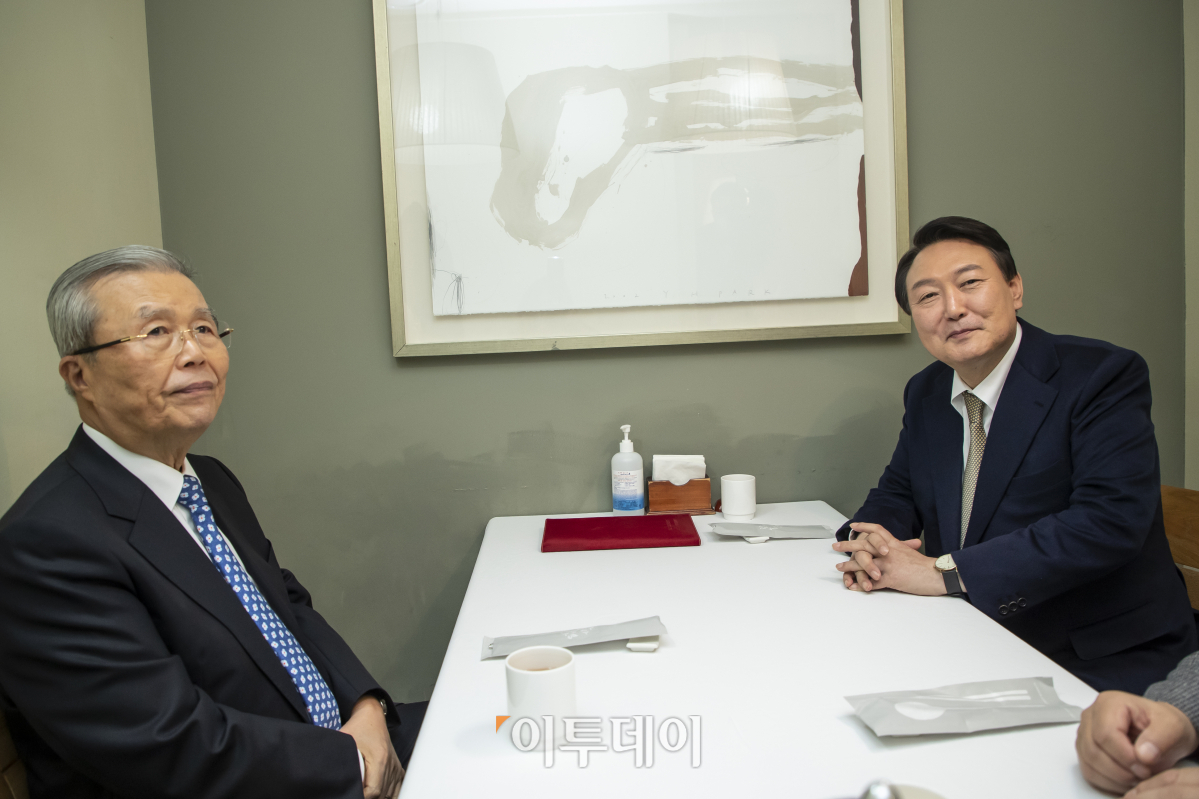 24일 윤석열 국민의힘 대선후보와 김종인 전 비상대책위원장이 만찬 회동을 하기 위해 서울시내의 한 식당에서 만났다. 국회사진취재단