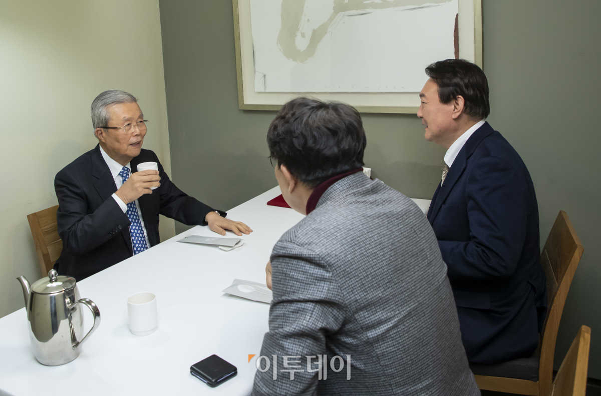 24일 윤석열 국민의힘 대선후보와 김종인 전 비상대책위원장이 서울 시내의 한 식당에서 만찬 회동을 하고있다. 권성동 의원이 배석했다. 국회사진취재단