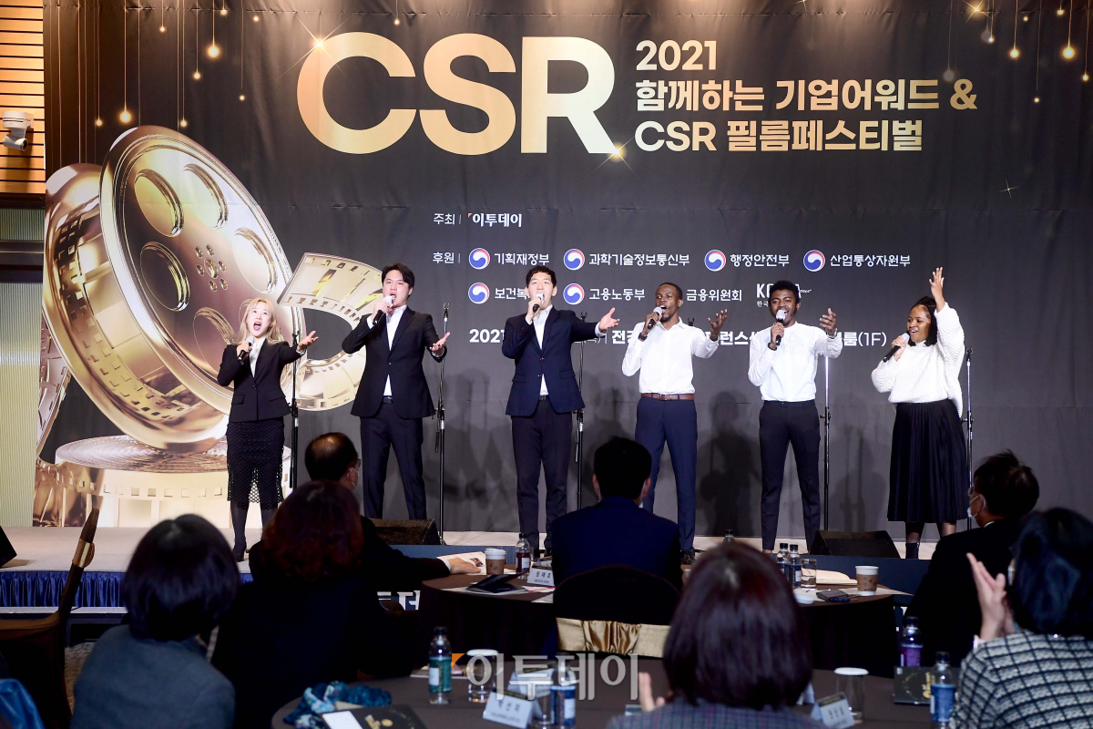 25일 서울 여의도 전경련회관 컨퍼런스센터에서 열린 ‘2021 함께하는 기업 어워드 & CSR 필름페스티벌’에서 국제협력 NGO인 아프리카인사이트가 축하공연을 하고 있다. 이투데이가 주최한 ‘함께하는 기업 어워드 & CSR 필름페스티벌’은 한 해 동안 사회적 가치 창출을 위해 도모한 ‘함께하는 기업’들의 CSR활동 발자취를 공모하고 그 업적을 치하, 격려하는 행사로 2012년 첫걸음을 내딛어 올해로 10회째를 맞이했다.
