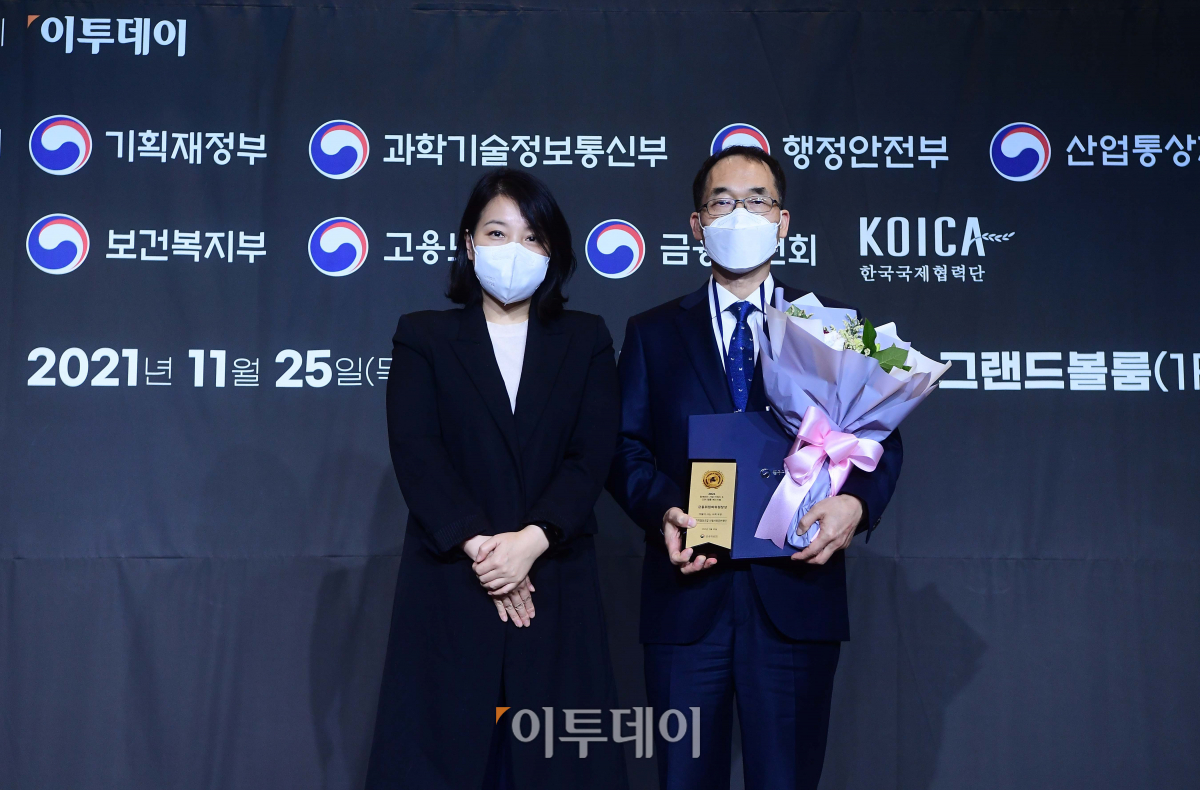 25일 서울 여의도 전경련회관 컨퍼런스센터에서 열린 ‘2021 함께하는 기업 어워드 & CSR 필름페스티벌’에서 김성주 사회적협동조합 신협사회공헌재단 부문장이 김재은 산업정책연구원 연구위원에게 금융위원회위원장상 더불어 사는 사회 부문을 수상한 뒤 기념촬영을 하고 있다. 이투데이가 주최한 ‘함께하는 기업 어워드 & CSR 필름페스티벌’은 한 해 동안 사회적 가치 창출을 위해 도모한 ‘함께하는 기업’들의 CSR활동 발자취를 공모하고 그 업적을 치하, 격려하는 행사로 2012년 첫걸음을 내딛어 올해로 10회째를 맞이했다.