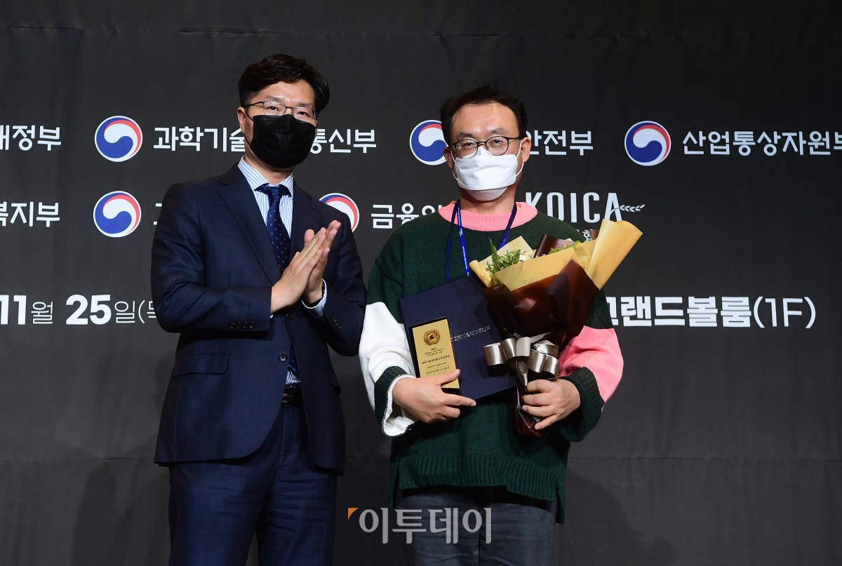 25일 서울 여의도 전경련회관 컨퍼런스센터에서 열린 ‘2021 함께하는 기업 어워드 & CSR 필름페스티벌’에서 강동식 현대오토에버 상무가 구혁채 과학기술정보통신부 대변인에게 과학기술정보통신부장관상 과학문화 저변확대 부문을 수상한 뒤 기념촬영을 하고 있다. 이투데이가 주최한 ‘함께하는 기업 어워드 & CSR 필름페스티벌’은 한 해 동안 사회적 가치 창출을 위해 도모한 ‘함께하는 기업’들의 CSR활동 발자취를 공모하고 그 업적을 치하, 격려하는 행사로 2012년 첫걸음을 내딛어 올해로 10회째를 맞이했다.