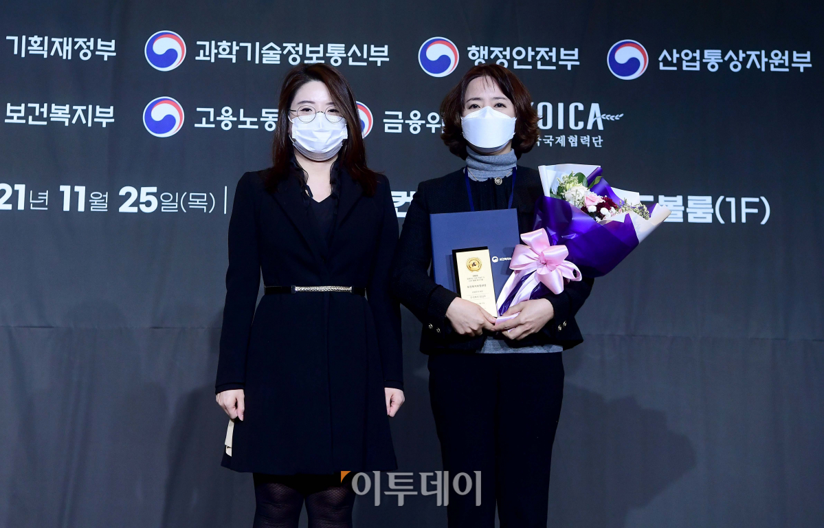 25일 서울 여의도 전경련회관 컨퍼런스센터에서 열린 ‘2021 함께하는 기업 어워드 & CSR 필름페스티벌’에서 박귀선 주식회사 담심포 대표이사가 임은정 보건복지부 사회서비스정책과장에게 보건복지부장관상 사회가치 부문을 수상한 뒤 기념촬영을 하고 있다. 이투데이가 주최한 ‘함께하는 기업 어워드 & CSR 필름페스티벌’은 한 해 동안 사회적 가치 창출을 위해 도모한 ‘함께하는 기업’들의 CSR활동 발자취를 공모하고 그 업적을 치하, 격려하는 행사로 2012년 첫걸음을 내딛어 올해로 10회째를 맞이했다.