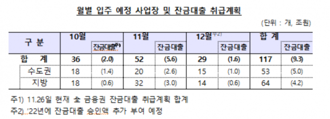 금융권은 4분기 입주 예정 사업장에 대해 9조3000억 원의 잔금대출을 취급할 계획이다. 월별로는 10월 입주 사업장에 2조 원, 11월 5조6000억 원, 12월 1조6000억 원이다.