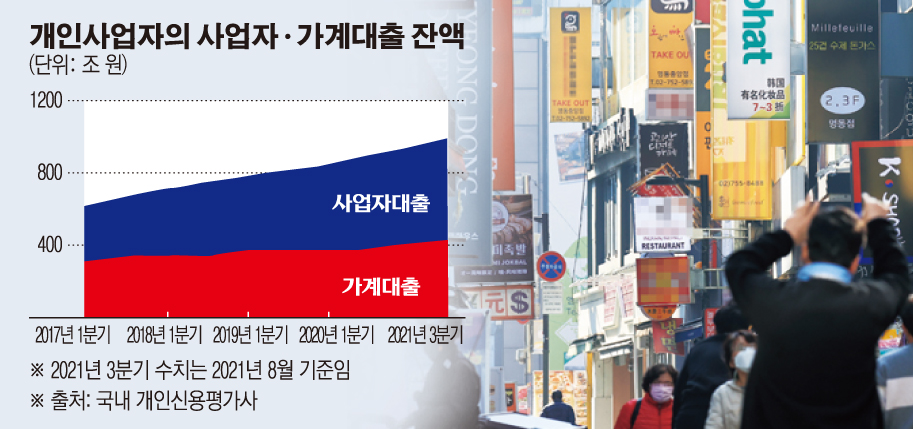 한국개발연구원(KDI)이 최근 내놓은 ‘자영업자 부채의 위험성 진단과 정책 방향’ 보고서에 따르면 올해 8월 말 기준 개인사업자의 대출 잔액은 사업자대출 572조6000억 원, 가계대출 415조9000억 원 등 총 988조5000억 원에 달한다. 코로나19 확산 직전인 2019년 12월 말과 비교하면 173조3000억 원 늘었다. 오윤해 KDI 연구위원은 “금리 인상과 가계대출 규제 강화, 원리금 상환 유예 조치가 종료되는 과정에서 코로나19 충격을 크게 받은 자영업자의 대출이 부실화할 가능성이 있다”고 지적했다.