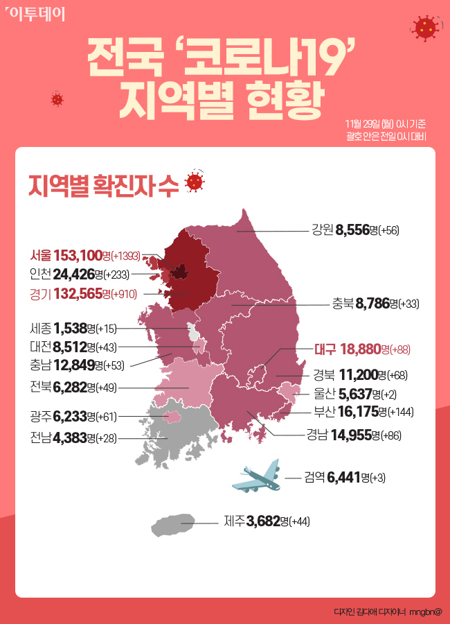 신규 확진자 3309명 중 1393명은 서울에서 발생했으며, 부산 144명, 대구 88명, 인천 233명, 광주 61명, 대전 43명, 울산 2명, 세종 15명, 경기 910명, 강원 56명, 충북 33명, 충남 53명, 전북 49명, 전남 28명, 경북 68명, 경남 86명, 제주에서 44명이 각각 확진됐다. 확진자 3309명 중 지역발생 확진자는 3286명으로 집계됐다. 검역소 확진자도 3명이 추가됐다.