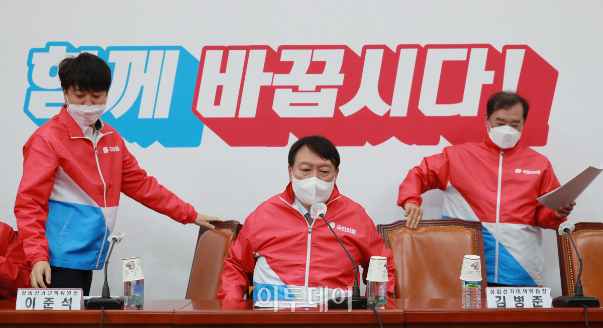 윤석열(가운데) 국민의힘 대선후보, 이준석(왼쪽), 김병준(오른쪽) 상임선거대책위원장이 29일 서울 여의도 국회에서 열린 중앙선거대책위원회 회의에 참석하고 있다.