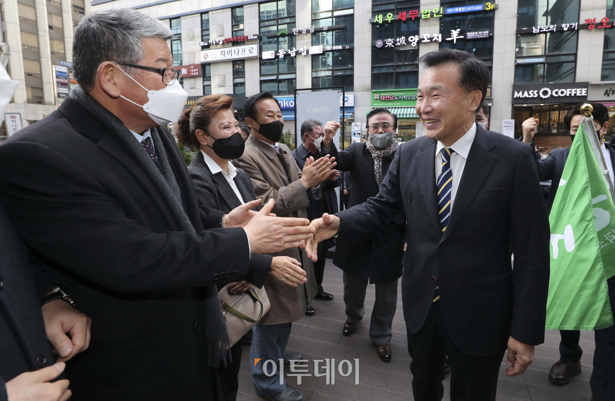 손학규 전 바른미래당 대표가 29일 서울 여의도 한 카페로 제20대 대선 출마 선언을 위해 이동하며 지지자들의 응원을 받고 있다.