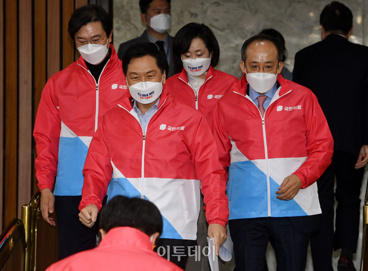 30일 오전 국회에서 열린 국민의힘 원내대책회의에서 김기현 원내대표가 회의실에 들어서고 있다.