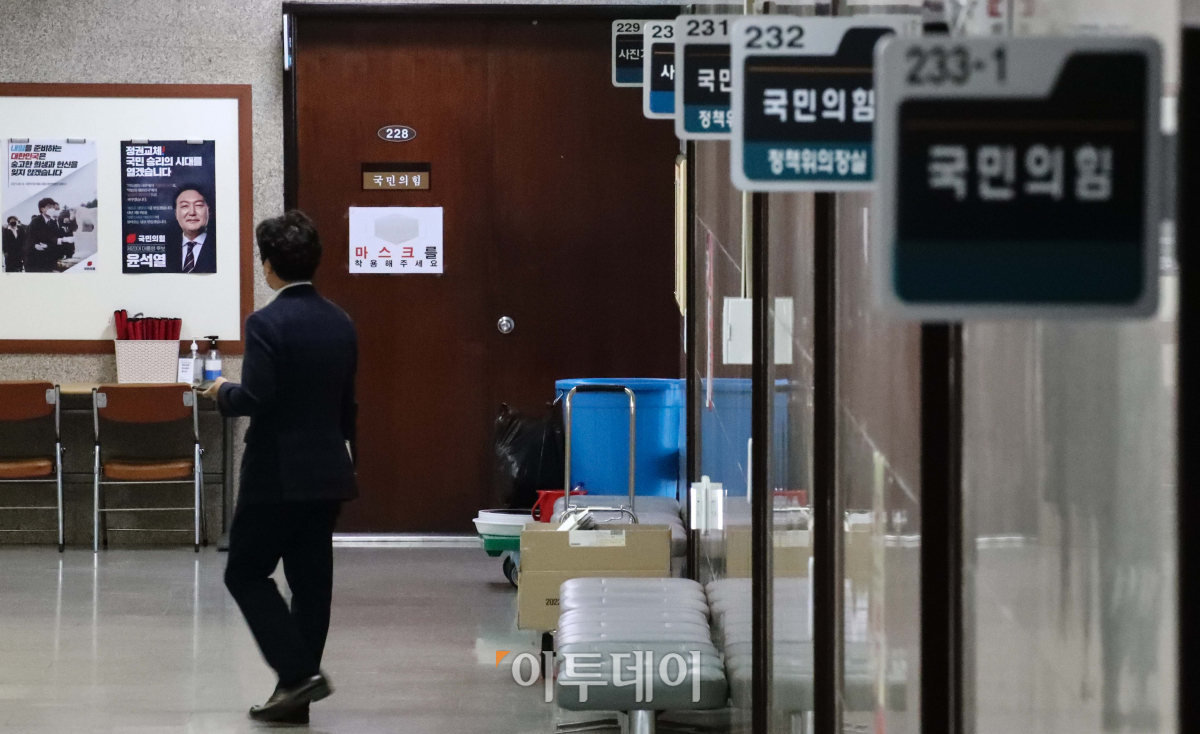 국민의힘 이준석 대표가 선거대책위원회 인재 영입 및 운영 관련해 윤석열 대선 후보측과 갈등이 이어지고 있는 1일 국회 국민의힘 사무실 복도에 관계자들이 바쁘게 다니고 있다.