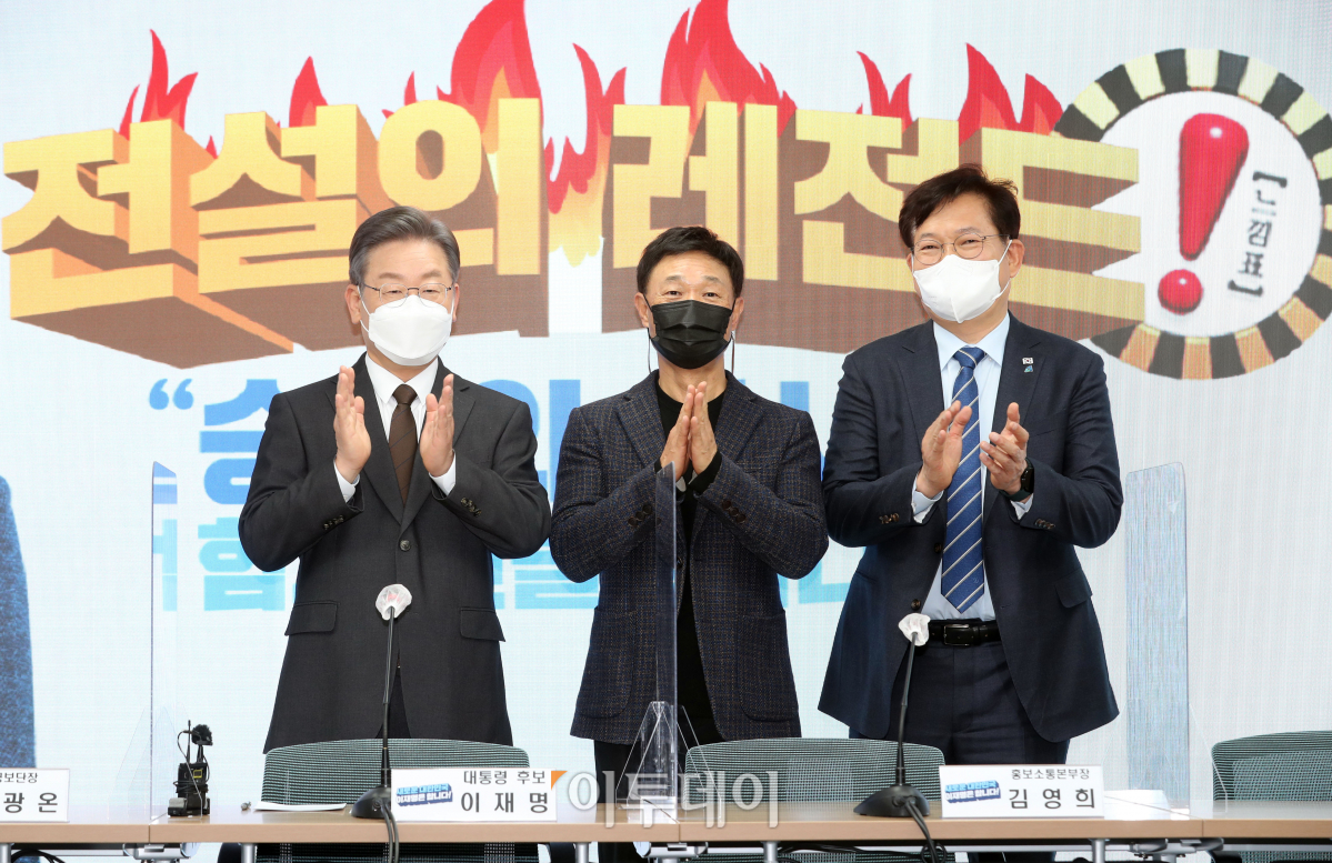 이재명(왼쪽) 더불어민주당 대통령 후보가 2일 오전 서울 여의도 더불어민주당 당사에서 홍보소통본부장으로 영입한 김영희(가운데) 전 MBC 부사장과 기념촬영을 하고 있다. 오른쪽은 송영길 공동상임선대위원장.