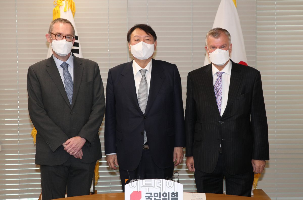 윤석열 국민의힘 대선 후보(가운데)가 2일 오전 서울 여의도 당사에서 사이먼 스미스 주한영국대사(오른쪽)와 콜린 크룩스 주북영국대사를 접견하고 있다.