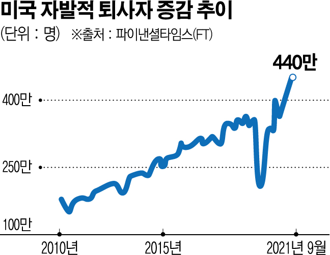 미국에선 9월 한 달에만 총 440만 명이 자발적으로 회사를 떠난 것으로 집계됐다. 2001년 8월 이후 20년 만에 최다 기록이다.