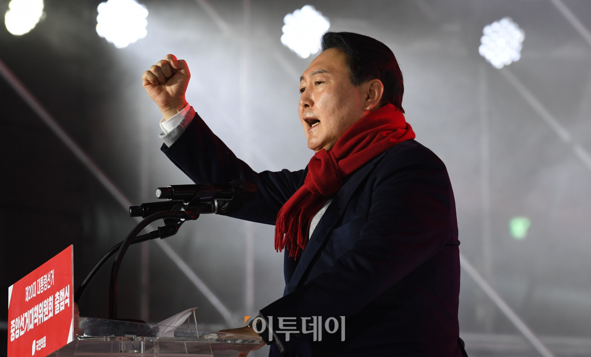 국민의힘 윤석열 대통령 후보가 6일 서울 송파구 올림픽체조경기장에서 열린 중앙선거대책위원회 출범식에서 후보 연설을 하고 있다. 국회사진취재단