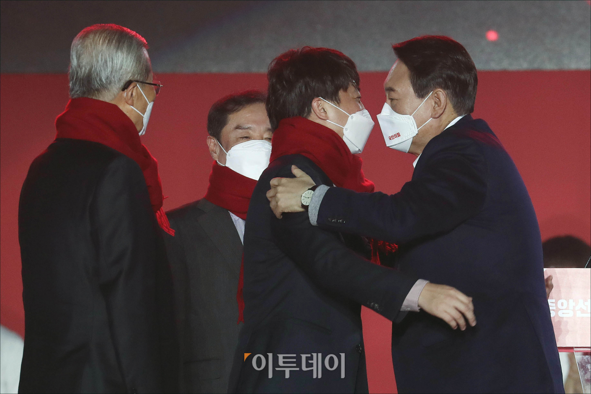 윤석열 국민의힘 대선 후보가 6일 오후 서울 송파구 올림픽공원 체조경기장에서 열린 국민의힘 제20대 대통령선거 선거대책위원회 출범식에서 이준석 대표에게 빨간색 목도리를 둘러주고 있다. 국회사진취재단