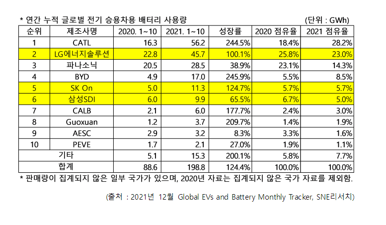 CATL과 BYD를 필두로 중국계 업체들이 성장세가 돋보였다. 중국 시장 팽창이 장기 추세로 자리 잡으면서 중국계 업체들 대부분의 점유율이 올라갔다. 반면 파나소닉과 PEVE 등 일본계 업체들은 성장률이 시장 평균에 크게 미치지 못해 대부분 점유율이 떨어졌다.