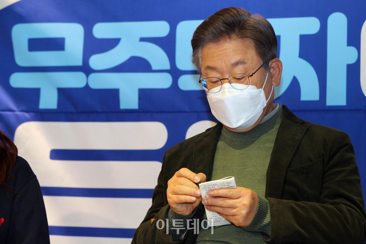 이재명 더불어민주당 대선 후보가 7일 오후 서울 마포구 한 모임 공간(앤드스페이스)에서 무주택자들과 ‘주택청약 사각지대’ 간담회에서 참가자들의 발언을 수첩에 적고 있다. 국회사진취재단