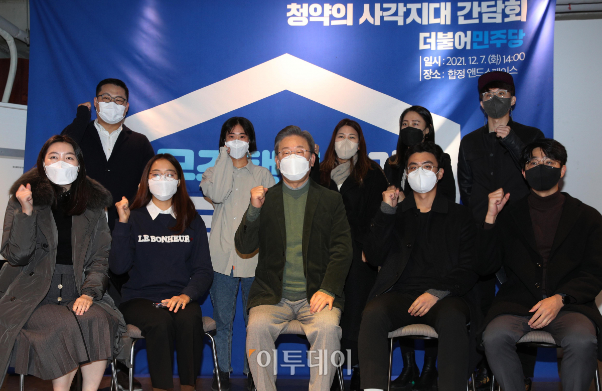 이재명 더불어민주당 대선 후보가 7일 오후 서울 마포구 한 모임 공간(앤드스페이스)에서 무주택자들과 ‘주택청약 사각지대’ 간담회에 앞서 기념 사진을 찍고있다. 국회사진취재단