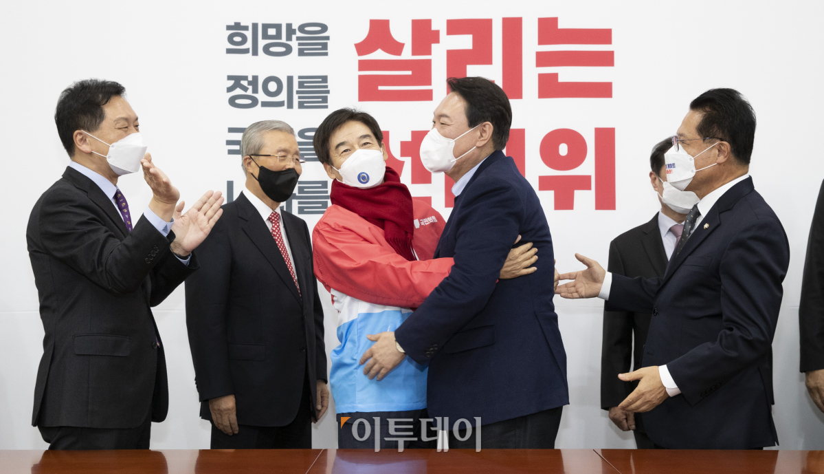윤석열 국민의힘 대선 후보가 7일 오후 국회에서 열린 입당식에서 이용호 의원과 포옹하고 있다.