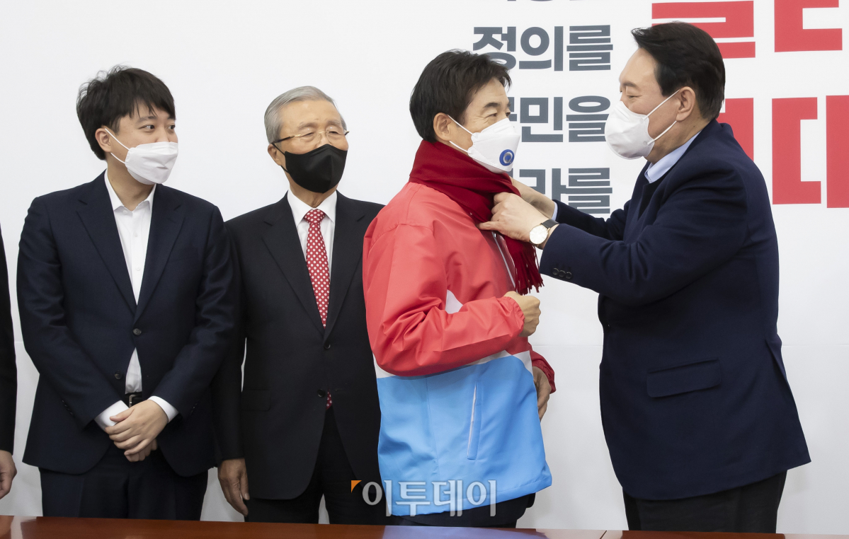 윤석열 국민의힘 대선 후보(오른쪽)가 7일 오후 국회에서 국민의힘에 입당한 이용호 의원에게 목도리를 둘러주고 있다.
