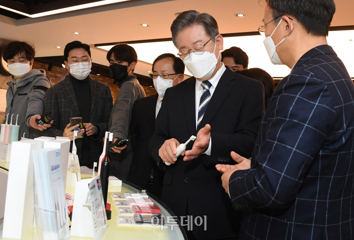 이재명 더불어민주당 대선 후보가 8일 오전 서울 금천구 아쿠아픽에서 중소.벤처기업 정책공약 발표에 앞서 한 중소 벤처기업 제품을 살펴보고 있다. 국회사진취재단