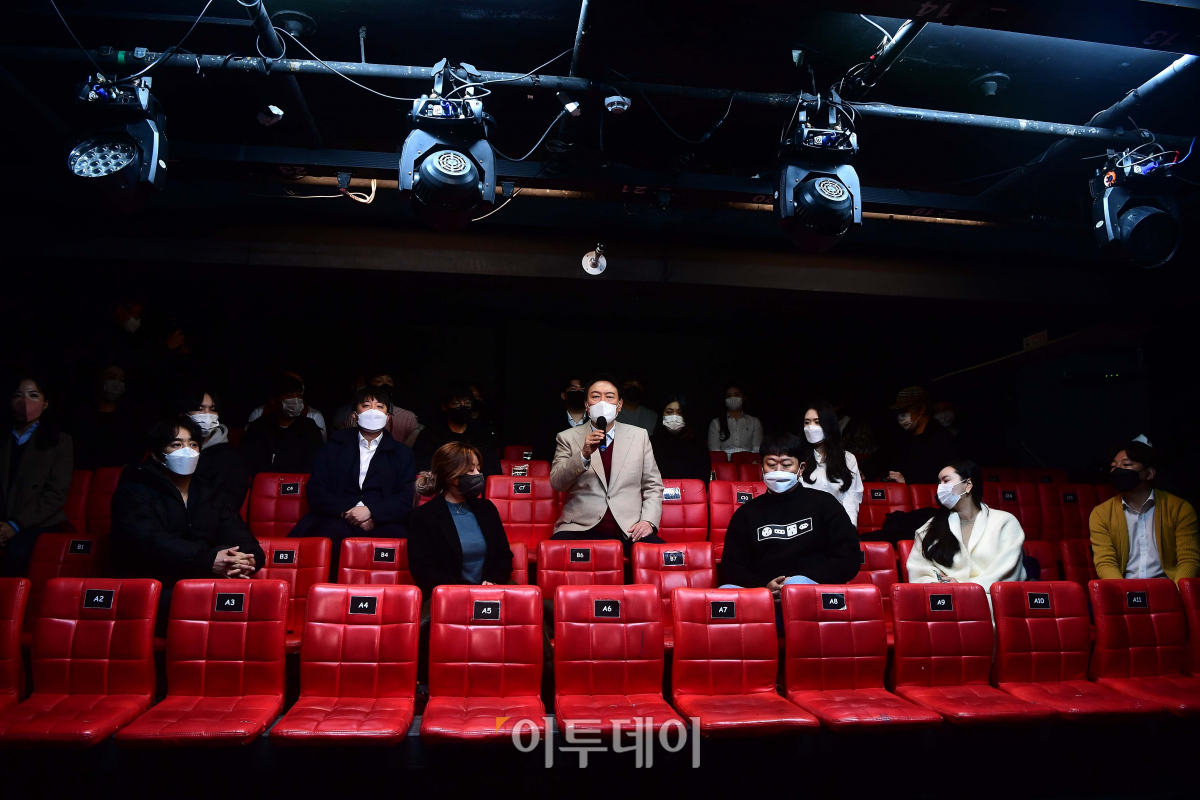 윤석열 국민의힘 대선후보가 8일 서울 종로구 대학로의 한 소극장에서 열린 청년문화예술인과의 간담회에서 인사말을 하고 있다.