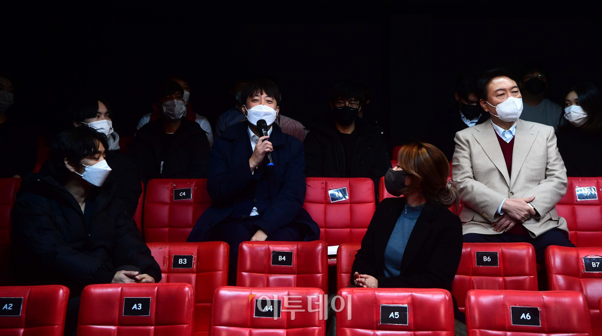 이준석 국민의힘 대표가 8일 서울 종로구 대학로의 한 소극장에서 열린 청년문화예술인과의 간담회에서 인사말을 하고 있다.