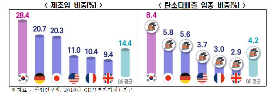 전경련에 따르면 한국은 제조업 등 탄소다배출 업종의 비중이 높다. 한국의 제조업 비중은 2019년 GDP(국내총생산) 기준 28.4%이며 철강, 화학, 정유, 시멘트 등 탄소다배출 업종의 GDP 비중은 8.4%이다. 이는 주요국 평균 제조업 비중(14.4%)과 탄소다배출 업종 비중(4.2%)의 약 두 배 수준이다.