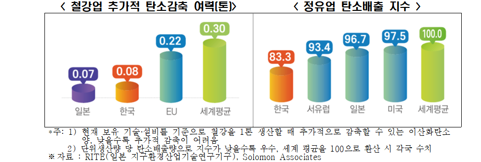 주요 다배출업종의 에너지소비ㆍ탄소배출 효율도 이미 최고 수준이어서 추가적 감축 여력도 제한적이다. 철강 업종은 현존하는 탄소감축 기술들이 대부분 적용돼있어 1톤(t)의 철강 생산 시 추가적 탄소 감축 여력이 일본에 이어 가장 적은 수준이다. 정유 업종은 단위생산량 당 탄소배출량이 세계 평균의 83.3% 수준으로 최고 수준의 효율을 기록하고 있다. 획기적 감축 기술이 개발ㆍ도입되지 않는 이상 추가적 감축 여력이 매우 제한적인 상황이다.