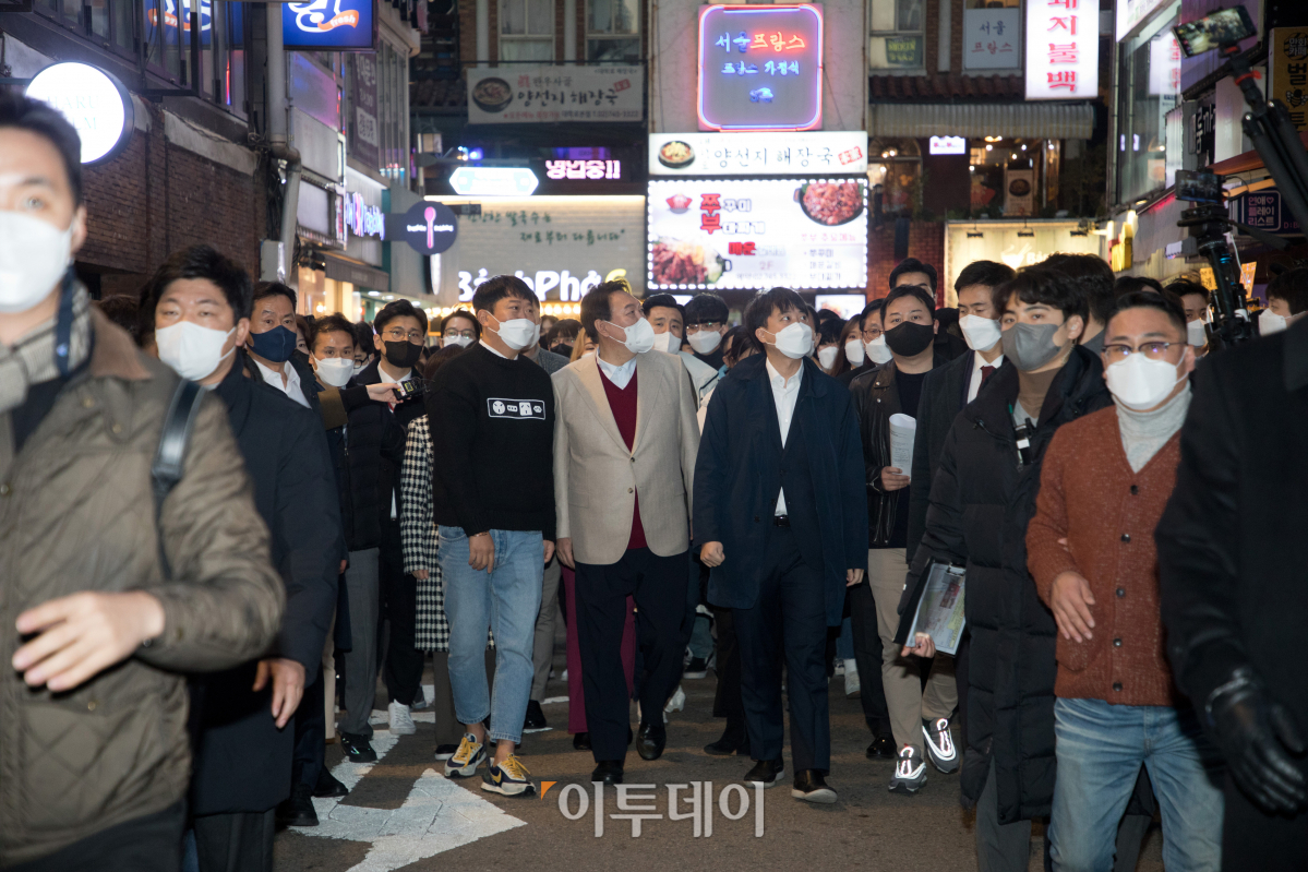 8일 오후 국민의힘 윤석열 대선 후보가 대학로 플렛폼74에서 열린 청년문화예술인간담회를 마친 뒤 마로니에 공원에서의 거리인사를 위해 이동하고 있다.