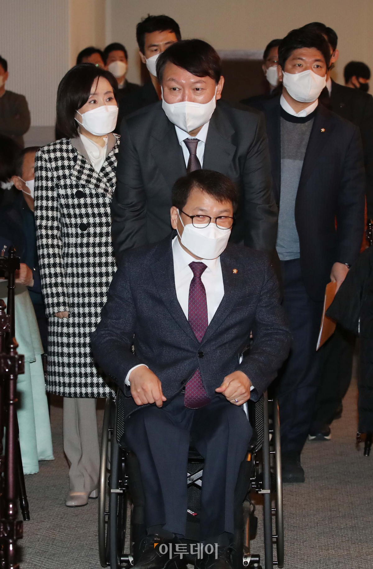 윤석열 국민의힘 대선 후보가 10일 서울 여의도 CCMM빌딩에서 열린 제23회 전국장애인지도자대회에 이종성 국민의힘 의원과 함께 입장하고 있다.