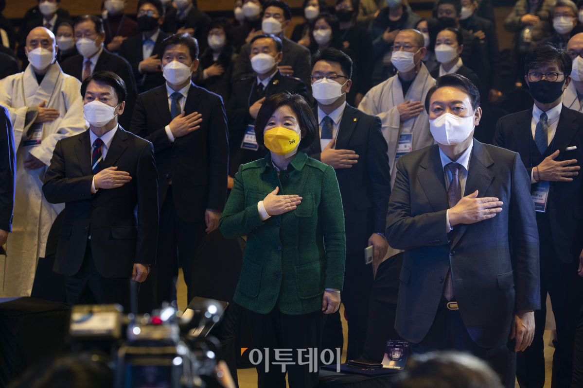 10일 오후 서울 강남 코엑스 전시장 D홀에서 열린 ‘<우리의 희망! 복지강국!>사회복지 비전선포대회’에 참가한 국민의힘 윤석열 대선후보(오른쪽부터)와 정의당 심상정 대선후보, 국민의당 안철수 대선 후보가 국민의례를 하고 있다. 국회사진취재단