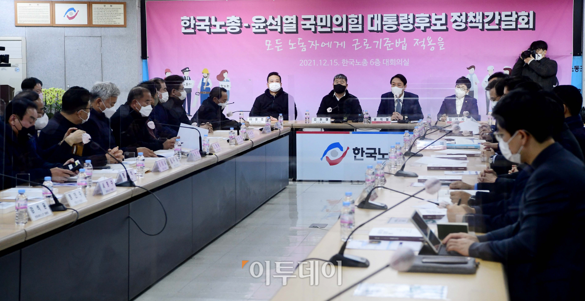 윤석열 국민의힘 대선후보가 15일 서울 여의도 한국노동조합총연맹에서 열린 ‘윤석열 후보-한국노총 간담회’에서 인사말을 하고 있다.