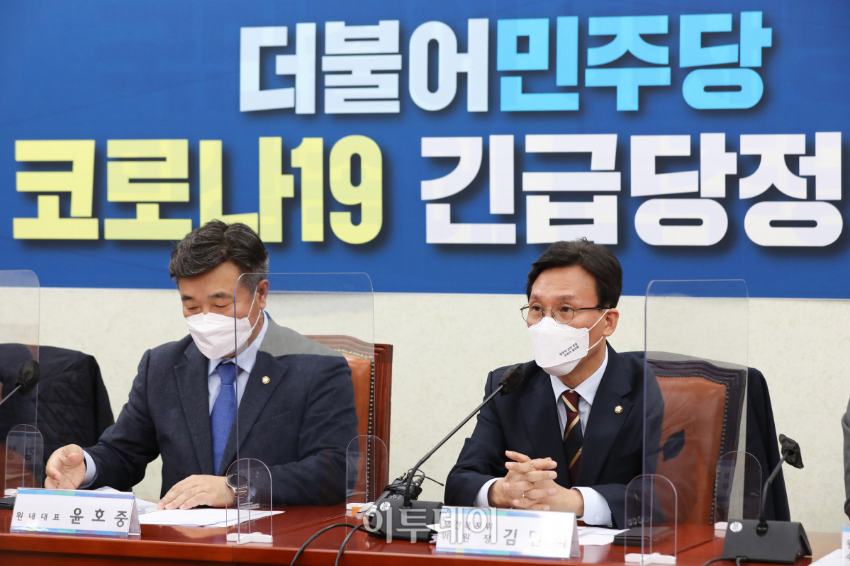김민석 국회 보건복지위원장이 15일 오후 국회에서 열린 더불어민주당 코로나19 긴급당정협의에서 모두발언을 하고 있다.