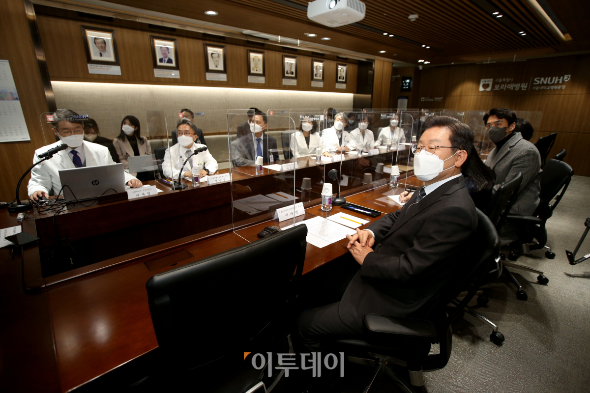 더불어민주당 이재명 대선 후보가 15일 오후 서울 동작구 서울특별시보라매병원을 현장 방문해 보라매병원 임원진에게 코로나19 대응 현황 보고를 받고 있다. 보라매병원은 감염병전담병원으로 코로나19 대응을 하고 있다. 국회사진취재단