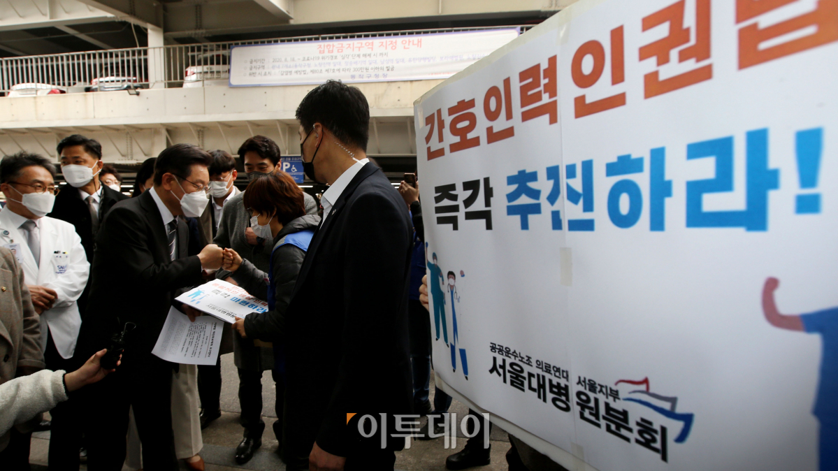 더불어민주당 이재명 대선 후보가 15일 오후 서울 동작구 서울특별시보라매병원에서 민주노총 공공운수노조 의료연대 서울대병원분회 관계자에게 요구사항을 전달받고 주먹인사를 나누고 있다. 국회사진취재단