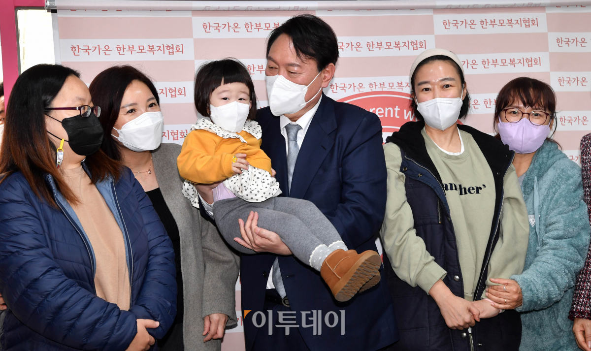 윤석열 국민의힘 대선후보는 15일 오후 성동구 가온한부모복지협의회를 찾아 협회 회원들과 간담회를 갖고 선물꾸러미 포장작업을 했다. '약자와의 동행' 일환으로 한부모들의 어려움을 듣는 자리로 마련됐다. 관계자들과 기념촬영을 하고 있다. 국회사진취재단