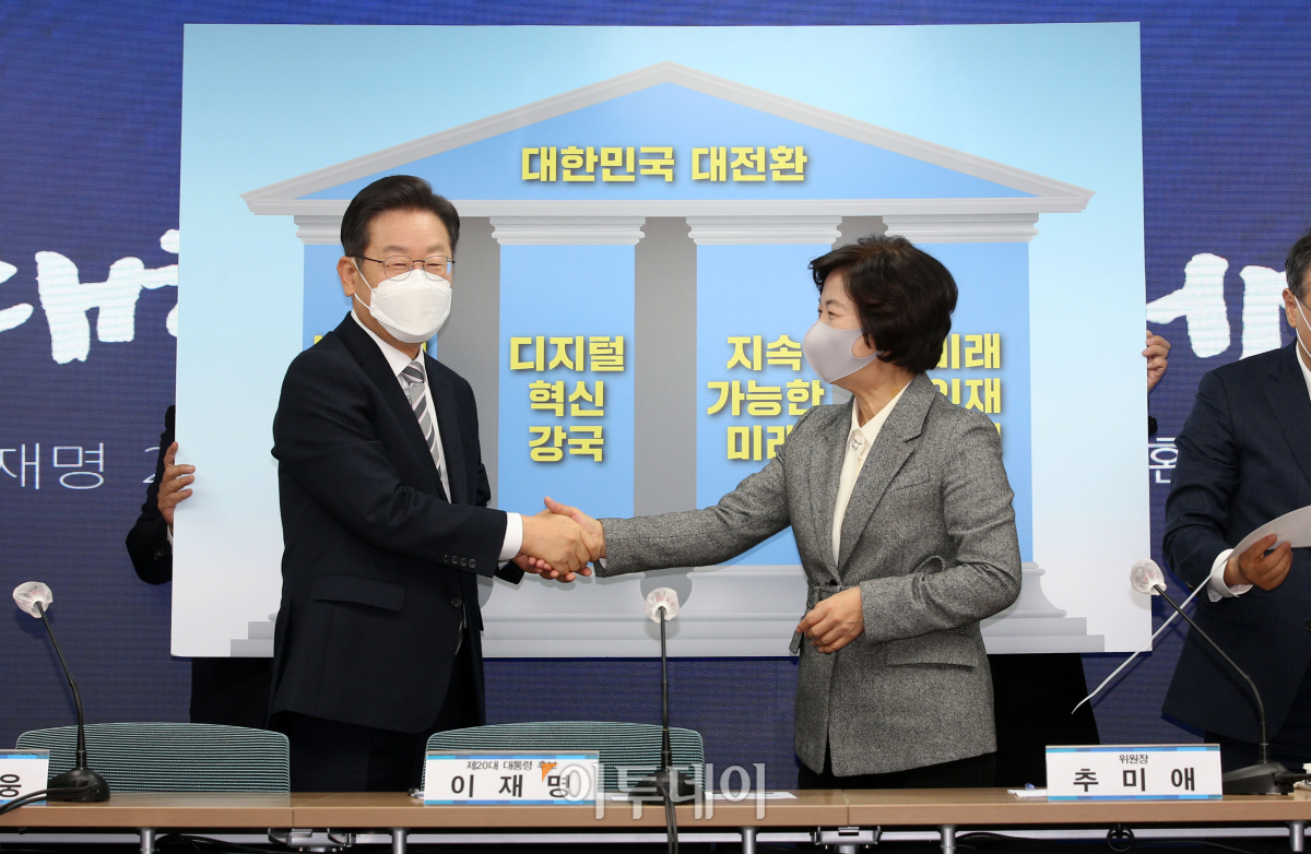 더불어민주당 이재명 대선 후보와 추미애 위원장이 16일 오전 서울 여의도 더불어민주당 중앙당사에서 열린 사회대전환위원회 출범식에서 퍼포먼스를 마친 뒤 악수를 나누고 있다.