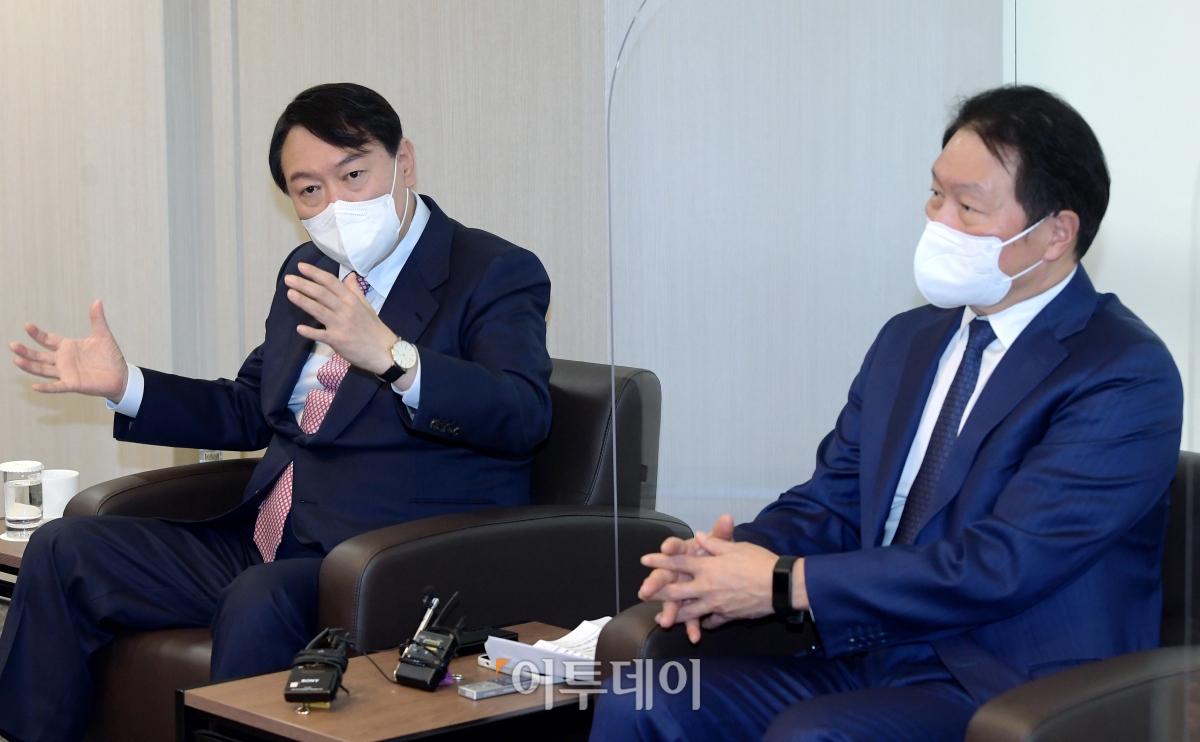 윤석열 국민의힘 대선 후보가 16일 오전 서울 중구 대한상공회의소에서 열린 최태원 대한상의 회장과의 간담회에서 발언하고 있다. 국회사진취재단