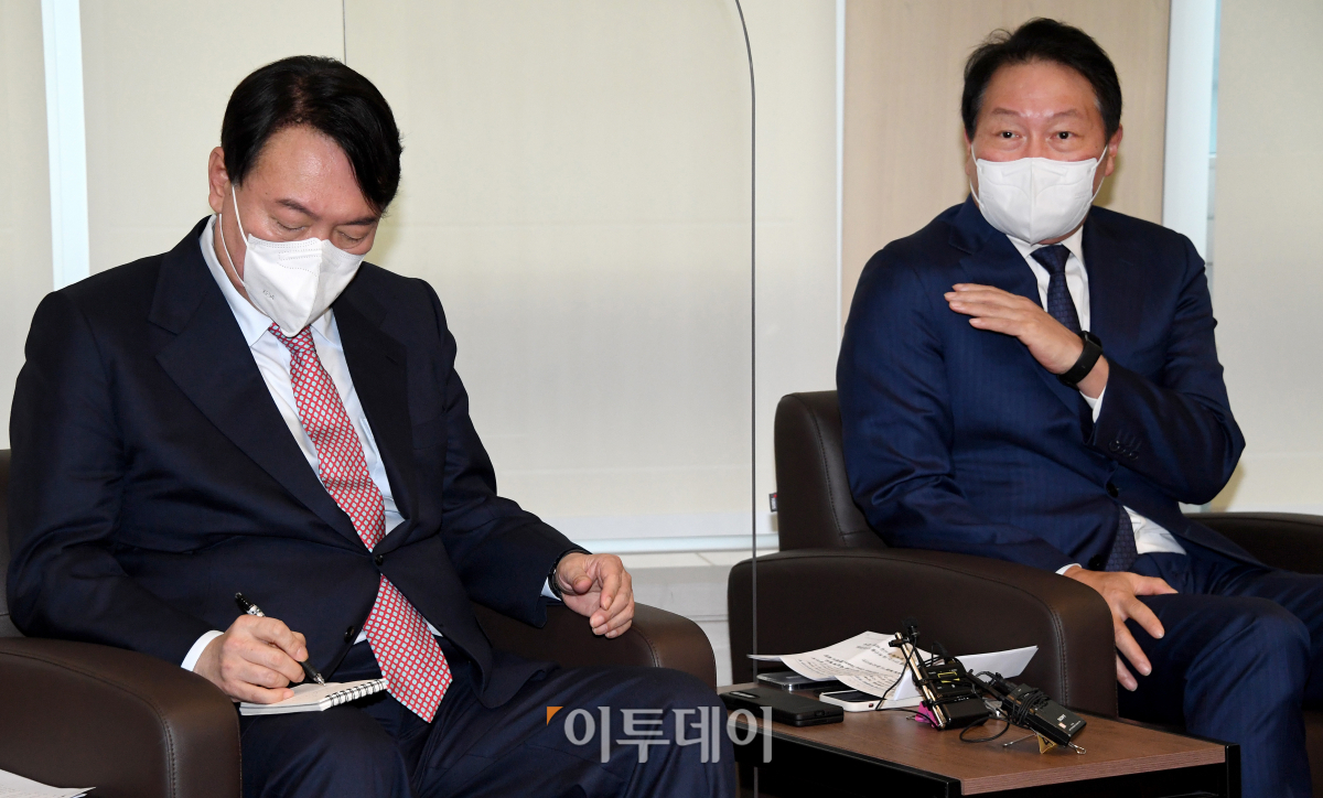 국민의힘 윤석열 (왼쪽)대선후보가 16일 서울 세종대로 대한상공회의소를 방문 최태원 대한상의회장의 발언을 수첩에 메모하고 있다. 국회사진취재단