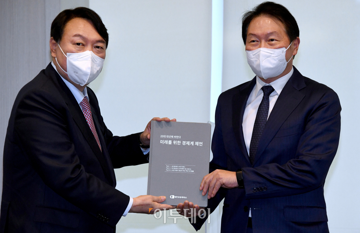 최태원(오른쪽) 대한상의회장이 16일 서울 세종대로 대한상공회의소를 방문한 국민의힘 윤석열 대선후보에게'미래를 위한 경제계 제언' 책자를 전달하고 있다. 국회사진취재단