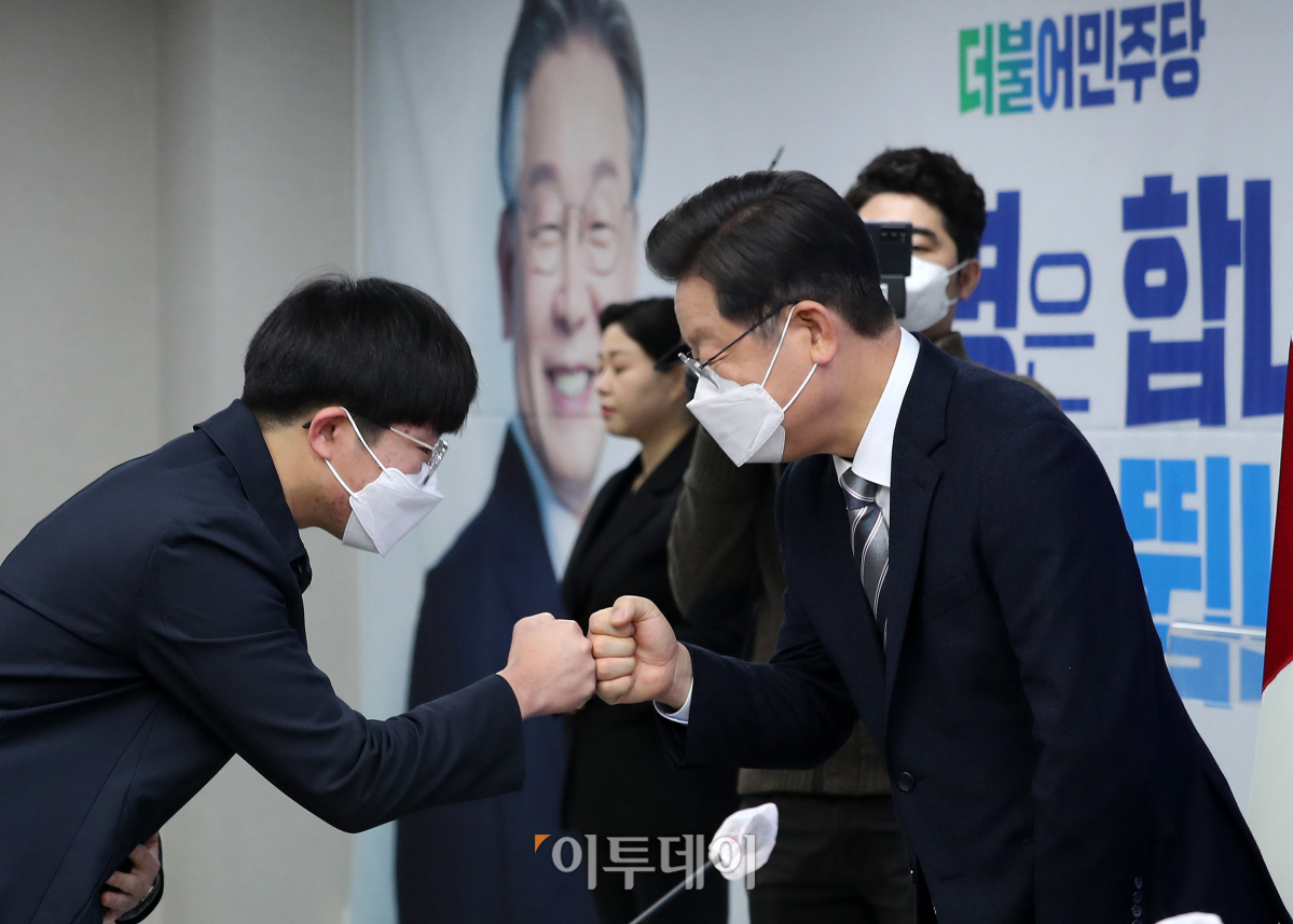 이재명 더불어민주당 대선후보가 16일 오전 서울 여의도 중앙당사에서 열린 2차 국가인재 영입발표에서 정예람 인천만수고 3학년 학생과 주먹인사를 나누고 있다.